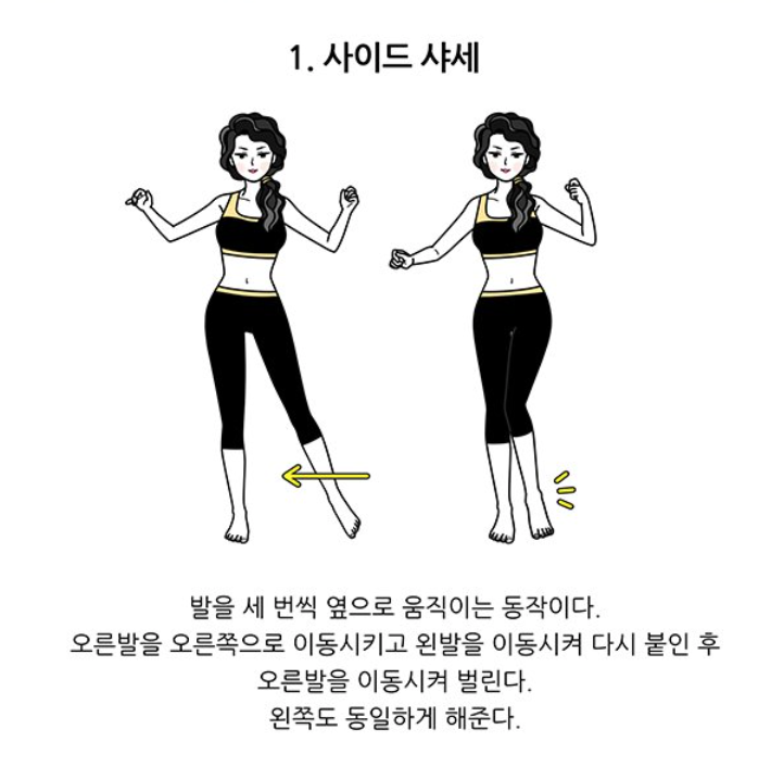 발을 세 번씩 옆으로 움직이는 동작이다. 오른발을 오른쪽으로 이동시키고 왼발을 이동시켜 다시 붙인 후 오른발을 이동시켜 벌린다. 왼쪽도 동일하게 해준다.