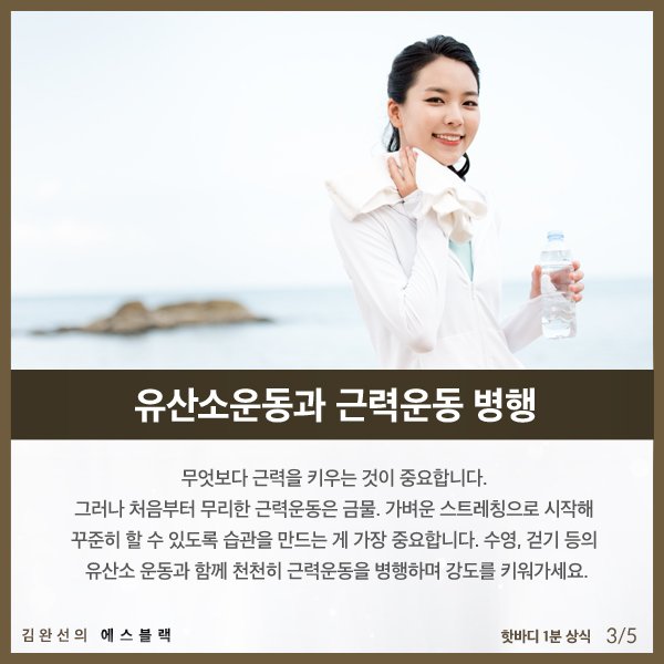 수영, 걷기 등의 유산소 운동과 함께 천천히 근력운동을 병행하며 강도를 키워가세요.기본적으로 등줄기에 땀이 날 정도의 강도로 해주시면 됩니다.