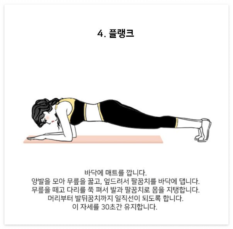 위 순서대로 20초간 운동을 반복하시고 10초 휴식을 취하는 방법으로 총 5세트 반복해주세요. 본인 체력에 맞춰 세트수를 적게 시작해 점점 늘리는 것도 좋습니다.