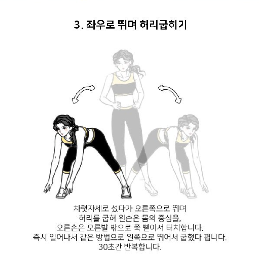 차렷자세로 섰다가 오른쪽으로 뛰며 허리를 굽혀 왼손은 몸의 중심을, 오른손은 오른발 밖으로 쭉 뻗어서 터치합니다. 즉시 일어나서 같은 방법으로 왼쪽으로 뛰어서 굽혔다 폅니다.