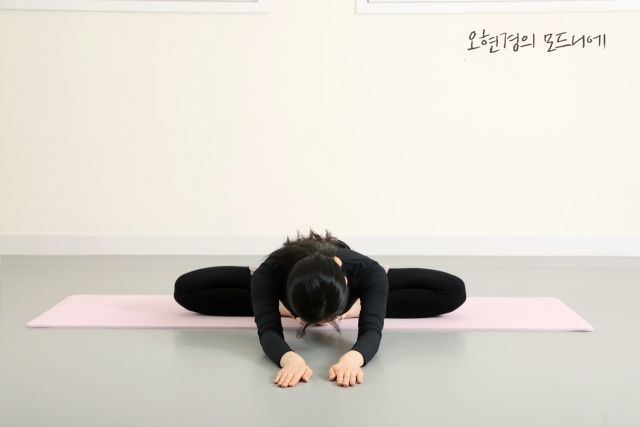 무릎을 꿇은 후에 서서히 무릎의 간격을 벌려주면서 바닥에 엎드리는 자세를 취합니다. 양쪽 무릎의 위치가 동일한지 확인 후 동작을 진행해주시고 고관절을 충분히 스트레칭 후에 진행하는 것이 좋습니다. 등과 어깨에 긴장이 주어지지 않도록 전신을 편안하게 이완한 상태에서 천천히 유연성이 되는 선까지만 진행해주세요