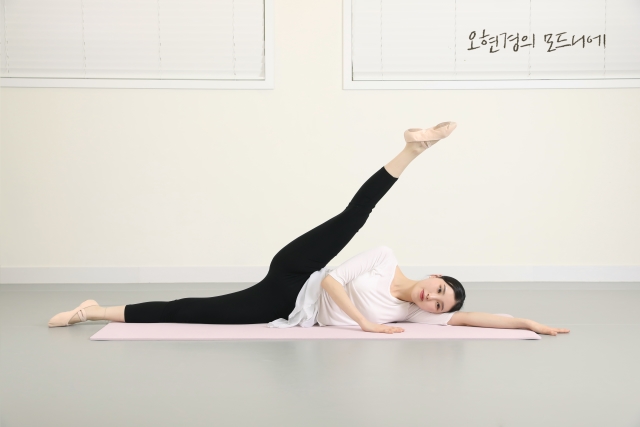 왼팔을 베고 옆으로 누워 다리와 발끝을 턴아웃으로 쭉 펴고, 오른손은 가슴 앞쪽 바닥을 집어 지지합니다. 이때 정수리와 골반, 무릎, 발가락이 일직선이 되어야 정확한 자세입니다. 오른쪽 다리를 귀에 붙인다는 생각으로 위쪽으로 힘차게 차고 내려주세요. 8회 3세트 합니다.