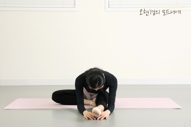 앉아서 왼쪽 다리를 길게 펴고 오른 다리를 ㄱ자 상태로 굽혀 왼쪽 무릎에 댑니다. 양손은 앞쪽에 편안히 놓은 뒤 허리를 펴줍니다. 숨을 내쉬며 무릎을 지그시 누르면서 고관절을 접는 느낌으로 배, 가슴, 머리 순으로 상체를 내려 8초간 유지한 뒤 상체를 세워주세요. 이때 무릎이 굽혀지지 않을 정도로 할 수 있는 만큼만 내려가세요. 좌우 5세트 반복합니다.