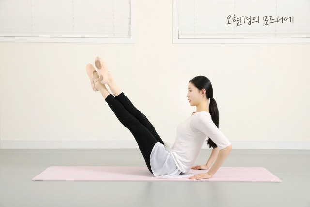 매트에 앉아 손은 뒤쪽으로 가볍게 짚고 중심도 약간 뒤쪽으로 옮겨줍니다. 다리는 허벅지부터 발끝까지 쭉 펴 45도 위로 올리며 포인 해주세요. 양발을 가위질하듯 앞뒤로 교차시킵니다. 좌우 교차를 8회, 총 3세트 해주세요. 발끝까지 힘을 주고, 등이 굽지 않도록 복근과 괄약근에 힘을 줘야 덜 힘듭니다. 더 높은 강도를 원한다면 다리를 위아래로 움직이며 진행해 주세요.