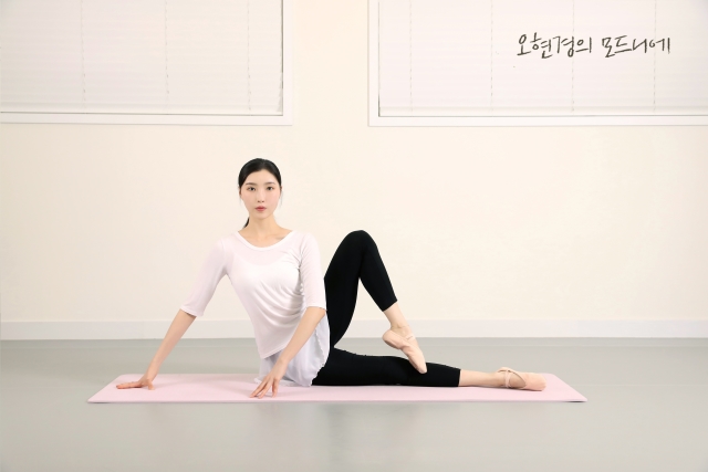 왼팔을 베고 옆으로 누워 오른손은 가슴 앞쪽 바닥을 짚고 다리는 턴 아웃으로 뻗어서 준비합니다. 오른쪽 발끝을 포인으로 다리를 타고 올라가 '파세'에서 준비해 주세요. 다리를 턴 아웃하여 어깨까지 끌어올린 후 천천히 무릎을 펴서 5초간 유지합니다. 이때 상체가 앞으로 기울어지거나 엉덩이가 뒤로 빠지지 않도록 주의해 주세요. 천천히 발끝을 허벅지에 붙여 파세로 돌아옵니다. 파세와 바뜨망 데벨로뻬를 한 세트로 8회 반복 후 다리를 길게 뻗으면서 천천히 내려주세요.