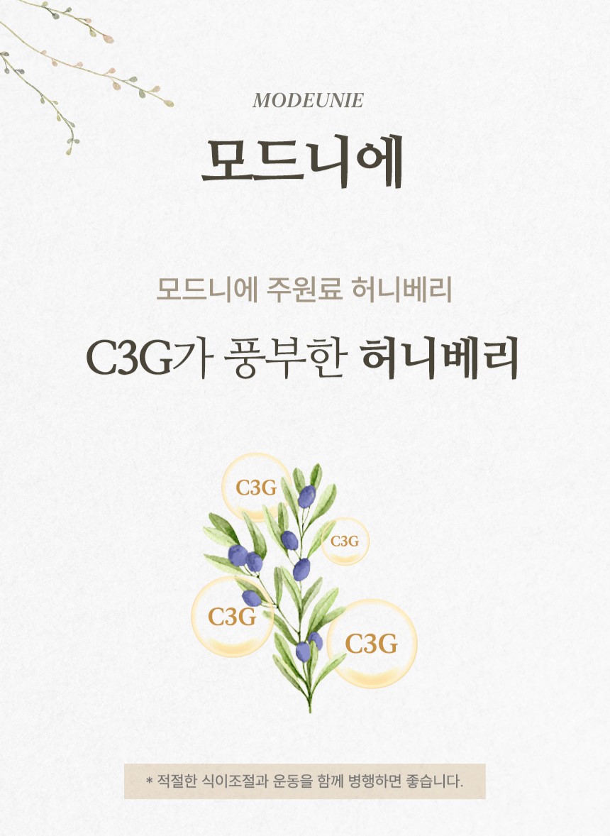 오현경의 모드니에는 허니베리를 주원료로 사용하였는데요. 이처럼 귀한 원료를 최대한 훼손하지 않고 화학부형제 첨가를 최소화한 7무부형제 공법으로 만들었습니다. 더불어, 함께 포함된 모드니에365로는 비타민B6와 풍부한 식이섬유를 함께 섭취할 수 있어요. 비타민B6는 단백질 및 아미노산 이용에 필요하며 혈액의 호모시스테인 수준을 정상으로 유지하는데도 필요한 비타민입니다. 또한 식이섬유 최고 함량의 차전자피분말이 90% 함유되어 있어서 1포만 섭취해도 식이섬유 4,050mg을 함께 섭취할 수 있습니다. 대부분의 다이어터분들께서 겪고 계시는 변비나 영양소 부족 부분 등을 채워주기 위한 든든한 짝꿍입니다. 이외에도 프락토올리고당 프리바이오틱스와 5종 혼합 유산균 프로바이오틱스, 새싹보리, 푸룬과즙, 슈퍼푸드 귀리 등이 알차게 포함되어 있습니다.