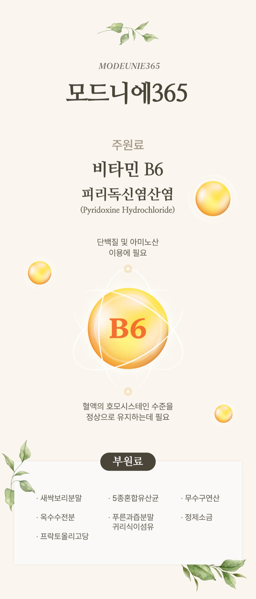 함께 포함된 모드니에365로는 비타민B6와 풍부한 식이섬유를 함께 섭취할 수 있어요. 비타민B6는 단백질 및 아미노산 이용에 필요하며 혈액의 호모시스테인 수준을 정상으로 유지하는데도 필요한 비타민입니다. 또한 식이섬유 최고 함량의 차전자피분말이 90% 함유되어 있어서 1포만 섭취해도 식이섬유 4,050mg을 함께 섭취할 수 있습니다. 대부분의 다이어터분들께서 겪고 계시는 변비나 영양소 부족 부분 등을 채워주기 위한 든든한 짝꿍입니다. 이외에도 프락토올리고당 프리바이오틱스와 5종 혼합 유산균 프로바이오틱스, 새싹보리, 푸룬과즙, 슈퍼푸드 귀리 등이 알차게 포함되어 있습니다.