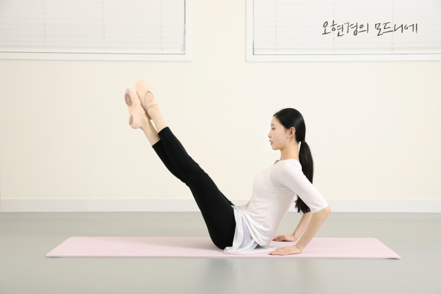 매트에 앉아 손은 뒤쪽으로 가볍게 짚고 중심도 약간 뒤쪽으로 옮겨줍니다. 다리는 허벅지부터 발끝까지 쭉 펴 45도 위로 올리며 포인 해주세요. 양발을 가위질하듯 앞뒤로 교차시킵니다. 좌우 교차를 8회, 총 3세트 해주세요. 발끝까지 힘을 주고, 등이 굽지 않도록 복근과 괄약근에 힘을 줘야 덜 힘듭니다. 더 높은 강도를 원한다면 다리를 위아래로 움직이며 진행해 주세요.